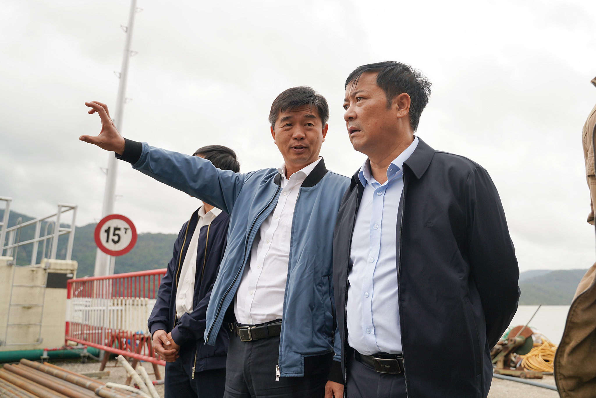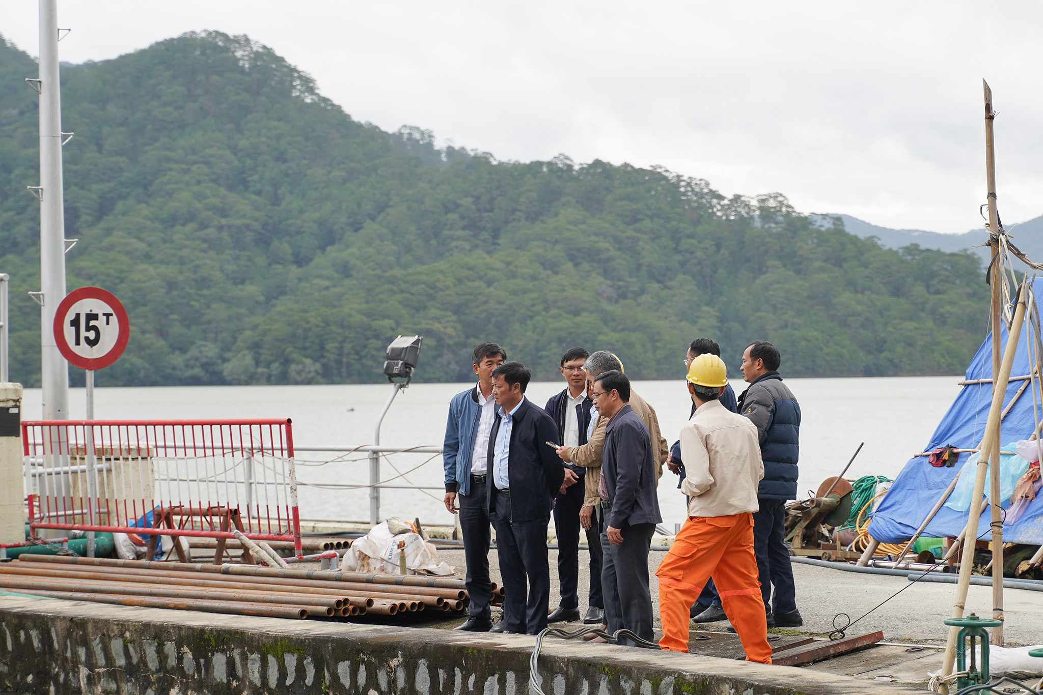 Ông Đỗ Minh Lộc (mang nón bảo hộ) Phó Tổng Giám đốc Công ty Cổ phần Thủy điện Đa Nhim - Hàm Thuận - Đa Mi báo cáo Phó Chủ tịch UBND tỉnh về công tác vận hành hồ thủy điện Đơn Dương